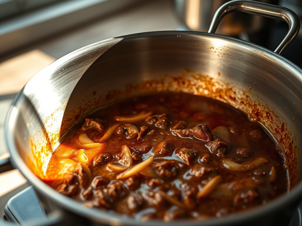 Pro Tip: This step creates a light emulsification between the rendered beef tallow and the added liquid. A professional saucier is ideal here for its rounded edges, which prevent spices from scorching in the corners of the pan.